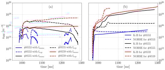 First to notice from Figure 4 is that both theories have the expected trend in density of RE rising from #8553 to #8559. Differently from discharge #7298 in Figure 3, the Kruskal–Bernstein theory does not give over , while do rise towards at the end of discharge for #8555 and #8559. For these two discharges, the Kruskal–Bernstein theory does not show a significant difference in . On the other hand, NORSE estimates that those two discharges are quite different—according to this code #8559 reaches slide-away regime already around 1060 ms, which is probably too early.
