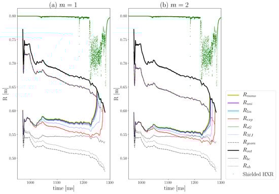 One can notice from Figure 5 that RE orbits are predicted in minor radius of 10–15 cm, which is not very limiting knowing that the COMPASS minor plasma radius is around 20 cm. RE orbits are localized more inside the plasma for higher m, as could be expected due to the higher peaking of profile. For the same reason, later significant losses of high energy RE are expected for higher m, which can be seen by slightly delayed equalization of the RE radius with (for 5–15 ms) for factor of current profile than in the case. However, both timings for significant high energy RE losses are a few tens of milliseconds after the Shielded HXR observes the losses, showing that these losses are probably due to the RE outward drift as is decreasing and connection of strong Shielded HXR signal and ramp-down phase is indeed observed in Figure 2b. On the other hand, this does not explain the interaction on the high-field side seen by the visible cameras.