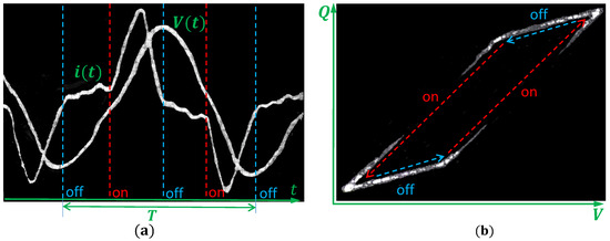 Oscilloscope screen shots of the measured electrical characteristics of DBD from [7]. (a) Measured voltage and current waveforms . Vertical lines indicate moments of switching between active (discharge on) and passive (discharge off) phases of DBD. T is the discharge period. (b) Charge voltage characteristics (-plot). The arrows indicate temporal development. The screen shots are reprinted from [7] with the permission of ©Electrochemical Society.