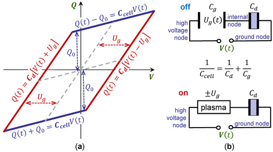 Interpretation of the classical charge-voltage characteristics of sinusoidal voltage-driven ozonizers. (a) Schematic presentation of the -plot. (b) Equivalent circuits corresponding to passive (plasma-off) and active (plasma on) discharge phases.