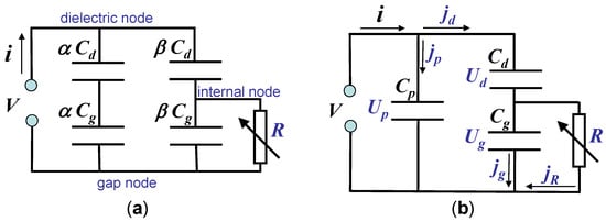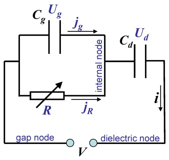 where is the voltage across dielectric barriers and is the current through the gas gap capacitance . Note that these equations do not contain any information or definition for R; thus, they are valid for any element R. This approach strongly differs from circuits with linear elements, where all circuit parameters can be obtained from a specified applied voltage . The element R can be nonlinear, and its properties are unknown. However, the measured current is an input parameter, in addition to .