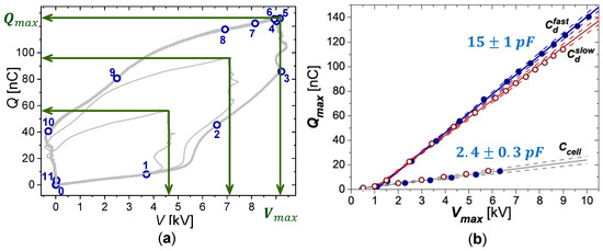 For interpretation of the charge-voltage characteristics, the authors suggested an equivalent circuit where the reactor cell is divided into a discharging () and non-discharging () part; see Figure 10a. The sum of the reactor parts is: . This representation has an additional physical meaning. The non-discharging part can be considered as a parasitic capacitance , and for simplicity, the equivalent circuit in Figure 10b can be considered.