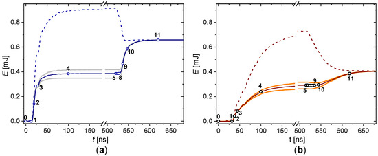 Instantaneous energy dissipated in DBD excited by square voltage pulses of 9 kV in amplitude with a rise time of 20 ns (a) and 70 ns (b). Experimental data from [13]. Dashed lines are the total energy defined as the integral of the product . Solid lines are the discharge energy defined as the integral of the products . Grey lines correspond to the extreme values of the energy caused by uncertainties in capacitance and displayed in Figure 6b. Enumerated moments for fast switching (a) are the same as in Figure 6a.
