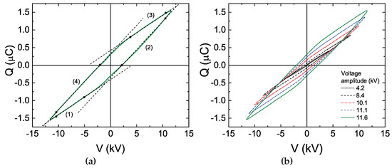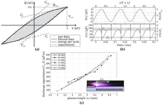 The surface discharge is a type of DBD, and the plasma expansion over the dielectric surface depends on the applied voltage amplitude. An example of the experimental data obtained from electrical diagnostics of a surface DBD [15] are presented in Figure 11. The measured -plot of a surface discharge has an almond-like shape (Figure 11a), and the authors suggest to use the charge derivative as a measure of the effective capacitance of the reactor. The examples of obtained values correlated with the voltage waveform are shown in Figure 11b.