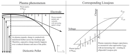The left side of Figure 12 depicts the region of contact between the dielectric pellet and the top electrode. The numerated areas are associated with the moments of discharge expansion over the pellet surface within the voltage period. The discharge expansion should lead to an increase of the effective reactor capacitance, and the selected moments might correlate with parts of the -plots, as shown in Figure 12. Similar to the surface discharge, the charge derivative near the maximum of the voltage amplitude reflects the dielectric capacitance for this voltage amplitude. At higher voltage amplitudes, the discharge occupies a larger surface, and consequently, the effective dielectric capacitance increases. This fact was inferred in terms of the equivalent circuit for partial discharging [14]; see Figure 10a. Thus, the current and voltage waveforms can be used for the estimation of the spread of the discharge, characterized by the coefficients and .