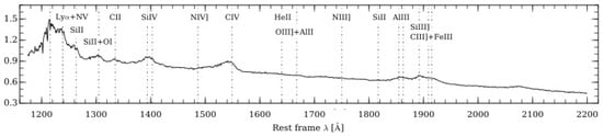 Diagnostics from the rest-frame UV spectrum takes advantage of the observations of strong resonance lines that are collisionally excited [,]. The point is that the rest-frame UV spectrum offers rich diagnostics that constrains at least gas density , ionization parameter U, and chemical abundance Z. For instance, Si II 1814/Si III] 1892 is sensitive to ionization CIV1549/Ly, CIV1549/(Si IV + OIV])1400, CIV1549/HeII1640, NV1240/HeII1640 are sensitive to metallicity; and Al III1860/Si III]1892, Si III]1892/CIII]1909 are sensitive to density, since inter-combination lines have a well defined critical density [].