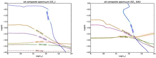 Intensity ratios in the plane ionization parameter vs. density, for the intensity ratios measured on the composite xA quasar spectrum shown in Figure 2 of []. left panel: solar chemical composition; right: solar chemical composition with selective enrichment in Al and Si, following []. In this latter case, the SiIV1402/CIV1549 is degenerate.