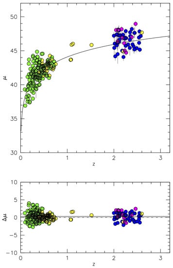 Hubble diagram distance modulus vs. z obtained from the analysis of the [] data (yellow: H, navy blue: Aliii1860 and Siiii]1892) supplemented by new H measurements from the SDSS obtained in this work (green) and from Gran Telescopio Canarias (GTC) observations of Martinez-Aldama et al. [] (magenta). The lower panel shows the distance modulus residuals with respect to concordance cosmology. The filled line in the upper panel is the (z) expected from cold dark matter (CDM) cosmology. The filled line in the lower panel represents a least-square fit to the residuals as a function of z. The figure is an updated version of Figure 1 of Marziani et al. [].