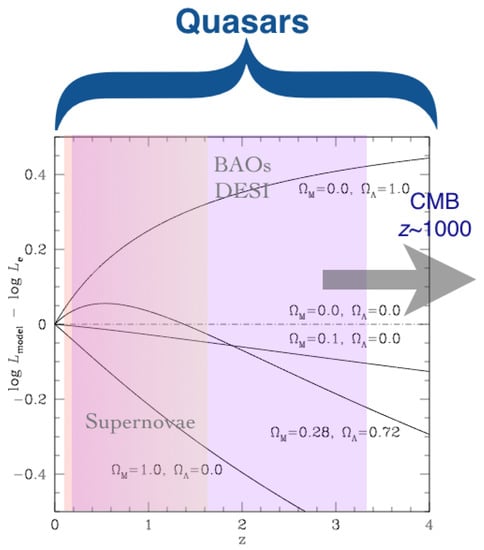 Mock samples of several hundreds of objects, even with significant dispersion in luminosity with rms() = 0.2–0.3, indicate that quasars covering the redshift range between 0 and 3 (i.e., a range of cosmic epochs from now to 2 Gyr since the Big Bang) could yield significant constraints on the cosmological parameters. A synthetic sample of 200 sources uniformly distributed in the redshift range 0–3 with a scatter of 0.2 dex yields at 1 confidence level, assuming km s Mpc, and flatness ( = 1). If is unconstrained, at 1 confidence level []. The comparison between the constraints set by supernova surveys and by a mock sample of 400 quasars with rms = 0.3 dex in shows the potential ability of the quasar sample to better constrain []. The scheme of Figure 5 illustrates the difference in sensitivity to cosmological parameters over the redshift range 0–4: supernovæ are sensitive to since the effect of , in a concordance cosmology scenario, became appreciable only at relatively recent cosmic epochs. High redshift quasars provide information on a redshift range where the expansion of the Universe was still being decelerated by the effect of , a range that is not yet covered by any standard ruler or candle.