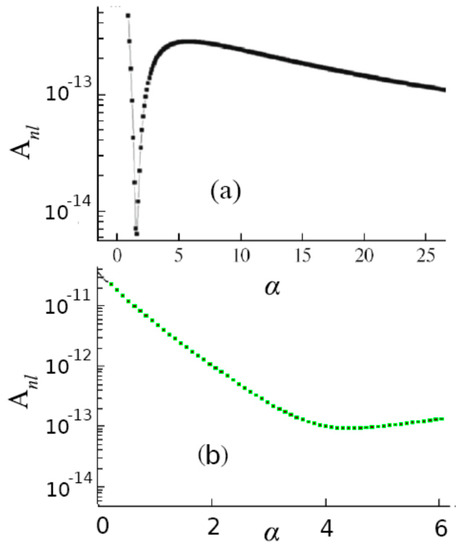(a) Natural width of Rydberg state of s-series (l = 0) with n = 30 as a function of parameter α of Sommerfeld’s atom. (b) The same for the state of p-series (l = 1) with n = 25. The Förster resonance corresponds to the value = 2.81.