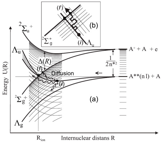 with the participation of Rydberg states pass through the phase of formation of the intermediate Rydberg complex . A fundamental contribution to “Rydberg Physics” was made by Fermi [44], who proposed considering the quasimolecular formation of as a structure that consists of two positively charged atomic cores , a quasi-free Rydberg electron (RE) in the Keplerian orbit, and the generalized valence electron (see Figure 3). The further development of the Fermi approach [45,46,47], the so-called dipole resonance ionization (DRI), has found wide application in the solution of a diverse range of problems (see, for example, the review [13]) from the broadening and shift of spectral lines to the balance of ionization processes in the solar photosphere (see, for example, [25,48]).