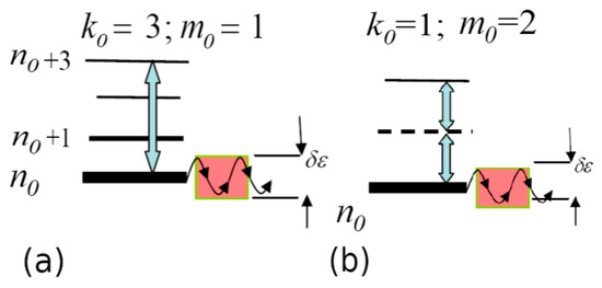 Note that the energy density of the levels can be expressed through the frequency of the classical revolution of the electron along the Keplerian orbit [32]. The realization of relation (9) is termed in the literature (see, for example, [27]) as the manifestation of a dynamic nonlinear resonance of the order in the vicinity of the energy (see Figure 5). In this case, the electron energy begins to oscillate with respect to its unperturbed value with the amplitude [26,27]: