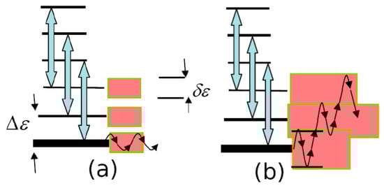 (a) Occurrence of dynamic nonlinear resonances without their widths overlapping. (b) Complete overlapping of widths , corresponding to the formation of the global dynamic chaos. The initial states correspond to the lowest levels (bold lines).