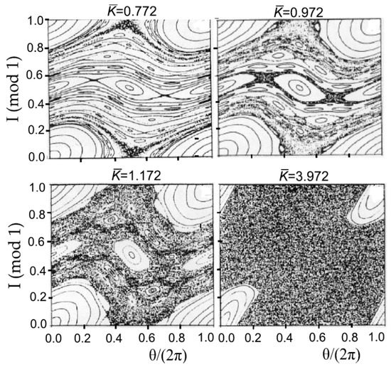 The characteristic important feature of the Hamiltonian (12) in the standard map model is the simultaneous overlapping of all resonance energies widths, as shown in Figure 6b. Figure 7 demonstrates the evolution of the rotor trajectories in the phase space for some parameter values. It is clearly seen that, initially (), small islands of instabilities (black areas) increase their size as the parameter increases, forming a “stochastic sea” for large amplitudes () of the external force.