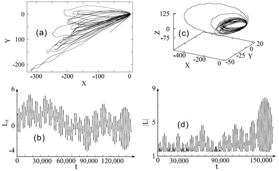 As an example, Figure 8 shows the trajectories of motion and shows the time dependence of the orbital angular momentum L in conditions of dynamic chaos development. We take the initial 10P () state of the hydrogen atom in the microwave field with frequency and amplitude , exceeding its threshold value [22]. Two characteristic initial configurations of the vector and the Runge-Lenz vector (directed along the semiaxis of the unperturbed Keplerian orbit [58]) were chosen, corresponding to the maximal changes in the modulus |L| for cases of two-dimensional () and three-dimensional () trajectories. Note that, according to the literature data, the range of values of n ≈ 10 corresponds to the range of strong interaction of the dipole field of the cluster with the Rydberg electron (see Figure 3). Also note that the results of numerical calculations in Figure 8 show a significant change of the orbital momentum L in the microwave field under the conditions of development of global chaos, which is in contrast to the main approximation of the authors [22,51], assuming the adiabatic invariance of L.