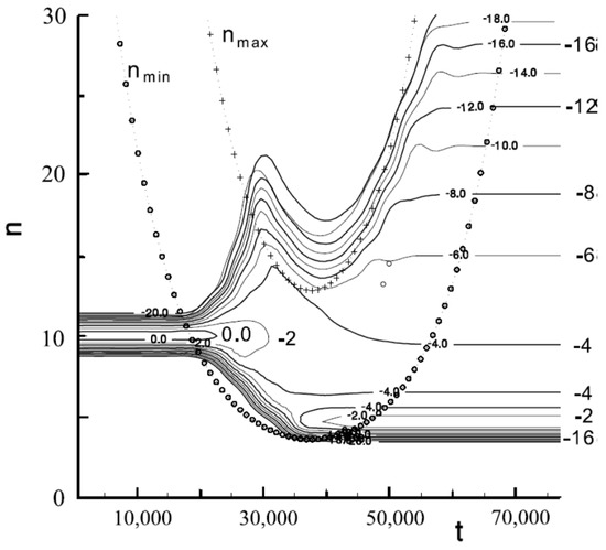 Figure 9 also shows the results of calculating [47]; the parameters of RE diffusion evolution for a time-varying region of the phase space. The initial distribution, corresponding to the localization of the RE at the energy level with , was chosen as the narrow Gaussian distribution . The principal feature of the present is the realization of the RE diffusion along the energy levels in the act of a single collision. The solid lines in the figure give a map of levels —the values of the logarithm are plotted alongside the corresponding curves. The position of the minima of the boundary curves is determined by the turning point with the minimum approach of the nuclei. It is evident that, while the initial value is located lower than , i.e., lies in the regular motion region, there is no diffusion along the n axis. Diffusion begins to develop after the moment of entry of the initial value in the stochastic region (the region lying above the curve ). As a result of stochastic diffusion, the Rydberg electron has a finite probability of reaching the ionization boundary and passing to a continuum of energies through the photoionization channel. In this case, ionization is found as the probability of the electron leaving the region of bound states. The validity of such a model was verified on the quantitative level by the example of the chemi-ionization process involving Rydberg atoms of sodium [49].