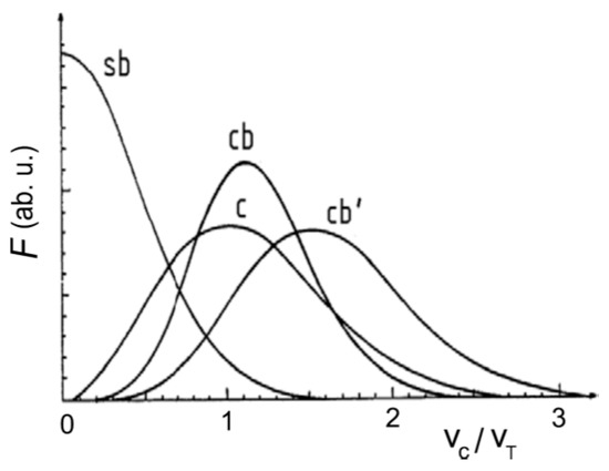 The velocity distribution dependence on the beams source temperature T may be expressed via the characteristic thermal velocity as . The function has quite different profiles in cells, single beams, and crossed beams cases, as demonstrated in Figure 10 [13,64].