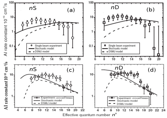 Figure 11 and Figure 12 show, following [53,60,66,67,68], the values of the associative ionization (AI) rate constants obtained under the conditions of a single and two orthogonal beams. The formation of molecular ion occurs upon the collisions of Rydberg sodium atoms excited to nS, nP, or nD states with atoms A in the ground state. Experimental data of Figure 11, frame (a) (dots, l = 1), corresponds to crossed beams conditions, T = 600 K [66]. Figure 11 data related to frame (b) (open circles, l = 1), frame (c) (open triangles, l = 2), and frame (d) (open squares, l = 2) were obtained in a single beam of Na atoms, T = 1000 K [67]. Full curves exhibit results of theory [60], accounting for stochastic diffusion effects, while dotted curves correspond to calculations in the frame of regular DSMJ model [43,44,45].