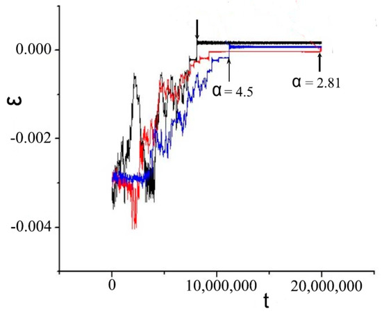 Figure 13 shows the time dependence of the RE binding energy under conditions of the development of diffusional ionization of Rydberg states of the model Sommerfeld atom, which is under the influence of an external microwave field, for different values of the Sommerfeld parameter α (see Equation (5)). It can be seen that the ionization time is significantly prolonged when the FR is realized (α = 2.81), which indicates the partial blockage of global stochatization.