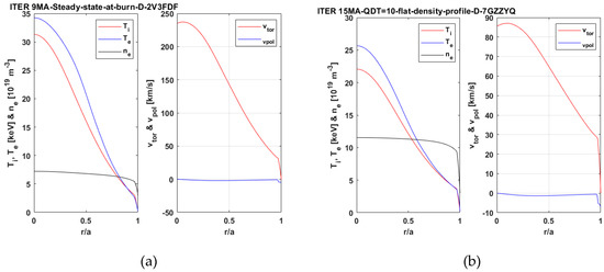 (a) ITER plasma profiles used for ADAS data 9MA_Steady_state_at_burn_D_2V3FDF; (b) High-density case: ITER plasma profiles 15MA_QDT=10_flat_density_profile_D_7GZZYQ.