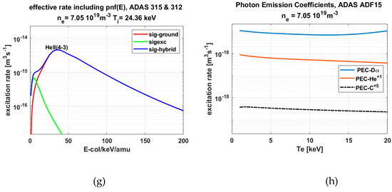 (a) Effective neutral beam beam emission spectroscopy (BES) Dα emission rate versus collisional energy, ADAS file ADF312(2003); (b) excited n = 2 population of injected neutral beam versus collisional energy, ADAS file ADF312(2003); (c) DI(3-2)-CX effective emission rate from ground (1s) and excited (n = 2) states, AFD315(1997); (d) NeX(10-9)-CX Effective emission rate from ground (1s) and excited (n = 2) states; (e) CVI(8-7)-CX Effective emission rate from ground (1s) and excited (n=2 )states; (f) BeIV(6-5)-CX effective emission rate from ground (1s) and excited (n = 2) states; (g) HeII(4-3)-CX Effective emission rate from ground (1s) and excited (n = 2 )states. The ADAS data base covers collisional rates up to 500 keV/am, see section on Fast Ion CXRS; (h) Photon emission coefficients for electron collisional excitation. PEC rates for HeII are about 250 times higher than those for CVI.