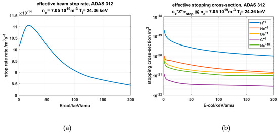 The ADAS effective stopping cross-sections σstop,z (see Figure 3b) for the injected neutral beam include ionization and charge exchange losses induced by electrons and ions [39,40].