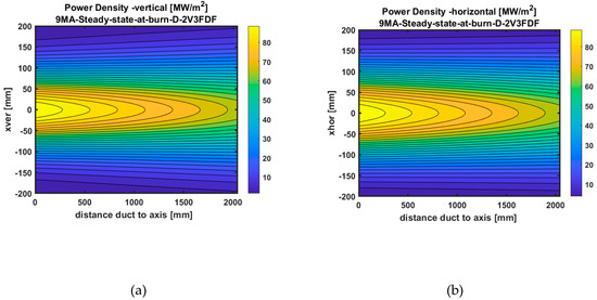 (a) ITER diagnostics neutral beam (DNB) power density profile in vertical direction versus distance from duct position (plasma-entry); (b) ITER DNB power density profile in horizontal direction versus distance from duct position (plasma-entry).