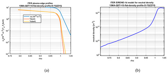 (a) Exponential extrapolation of plasma profiles beyond separatrix (ρ = 1) to wall location assumed at (ρ = 1.05) ITER 15 MA-QDT-10-flat density scenario; (b) EIRENE neutral density modeling for atomic density (nH)). ITER 15 MA-QDT-10-flat density scenario.