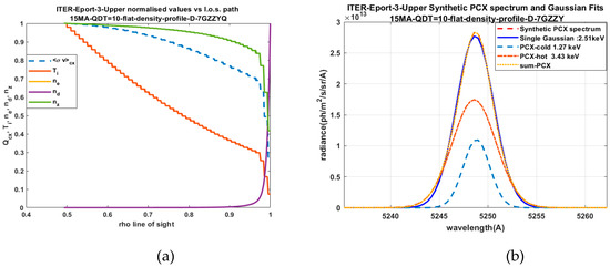 The line of sight integration along path s is mapped on the associated magnetic flux coordinate ρ = r/α. The Doppler width λd(ρ) and Doppler shift λ0 represent local ion temperatures and plasma rotation. The following example (Figure 6b) illustrates the potential asymmetric and non-Gaussian character of the resulting synthetic PCX spectrum for the ITER high-density case.