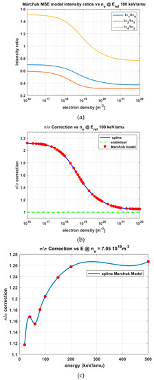 (a) Collisional model for Motional Stark Effect (MSE) multiplet line ratios. Ebeam 100 keV/amu; (b) collisional model for MSE multiplet: Ratio of π/σ net emission and its deviation from statistical population versus density; (c) collisional model for MSE multiplet showing the ratio between π to σ emission and its deviation from statistical population versus energy. ne = 7.2·1019 m−3, Ti = Te = 20 keV.