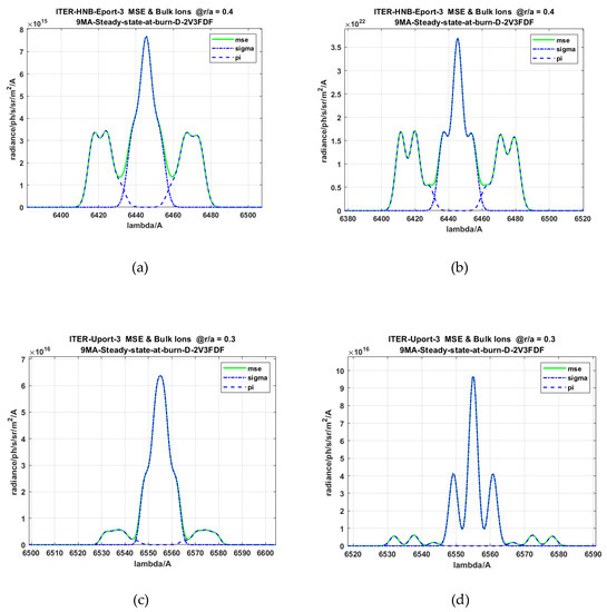 (a) asymmetric MSE spectrum, HNB 500 keV/amu, Finite Ion Grid presentation with 64 * 20 beamlets. ITER 9MA scenario, E-port-3, ρ = 0.4, dispersion is 0.85 nm/mm; (b) asymmetric MSE spectrum, HNB 500 keV/amu Single-Point Ion Grid presentation. ITER 9MA scenario, E-port-3, ρ = 0.4, dispersion is 0.85 nm/mm; (c) asymmetric MSE spectrum. DNB 100 keV/amu, Finite Ion Grid presentation with 64 * 20 beamlets with 5 mrad divergence. ITER 9MA steady state scenario, U-port-3, ρ = 0.3, disp = 0.55 nm/mm; (d) asymmetric MSE spectrum. DNB 100keV/amu. Single-Point Ion Grid presentation, DNB divergence 10 mrad. ITER 9MA steady-state scenario, U-port-3, ρ = 0.3, disp = 0.55 nm/mm.