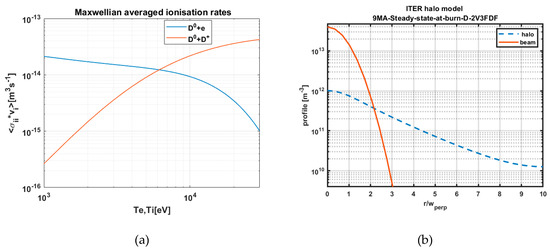 (a) Electron- and Ion-ionisation rates used for Halo model; (b) Halo and beam density profile, ITER, DNB 100keV/amu, 9MA scenario.
