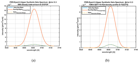 (a) Prompt HeII CX spectrum, synthetic line of sighted integrated halo spectrum and Gaussian prompt spectrum normalized to halo amplitude. Ratio Ihalo/(Iprompt+Ihalo) = 0.07for the 9 MA-steady-state-at-burn scenario; (b) Prompt HeII CX spectrum, synthetic line of sighted integrated halo spectrum and Gaussian prompt spectrum normalized to halo amplitude Ratio Ihalo/(Iprompt+Ihalo) = 0.16. for the 15 MA flat density scenario.