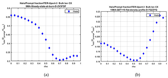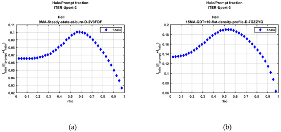 (a) radial profile of halo fraction (Ihalo/(Iprompt+Ihalo), HeII 9MA-steady-state-at-burn scenario; (b) radial profile of halo fraction (Ihalo/(Iprompt+Ihalo), HeII 15MA-flat-density scenario.