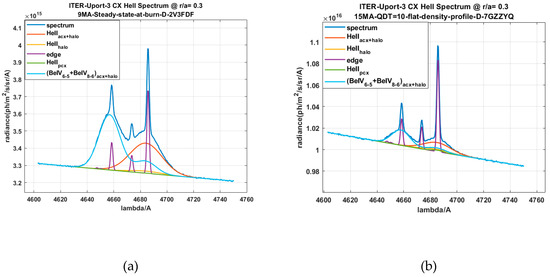 (a) SOS halo-model spectrum for HeII/BeIV CX Spectra. The synthetic line-of-sight-integrated spectra for halo and PCX components is only shown for HeII. Halo fraction 13% 9MA_Steady_state_at_burn_D_2V3FDF; (b) SOS halo-model spectrum for HeII/BeIV CX Spectra. The synthetic line of sight integrated spectra for halo and PCX component is only shown for HeII. Halo fraction 23% 15MA-flat-density scenario.