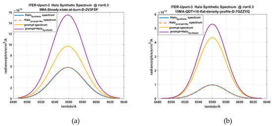 (a) Dα Spectrum with prompt signal and comparison of Gaussian-like halo shape and Synthetic l.o.s. integrated halo shape. 9MA_Steady_state_at_burn_D_2V3FDF; (b) Dα Spectrum with prompt signal and comparison of Gaussian-like halo shape and Synthetic l.o.s. integrated halo shape. 15MA_QDT=10_flat_density_profile_D_7GZZYQ.