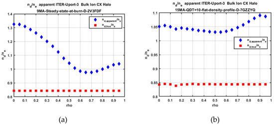 (a) Retrieval of plasma dilution nd/ne from from measured Dα spectrum. Blue rhombs, apparent values, without correction for halo effect. Red squares, applying halo effect leads to consistent and sensible dilution values <1; (b) Retrieval of plasma dilution nd/ne from from measured charge-exchange recombination spectroscopy (CXRS) Dα spectrum. Blue rhombs, apparent values, without correction for halo effect. Red squares, applying halo effect leads to consistent and sensible dilution values <1.