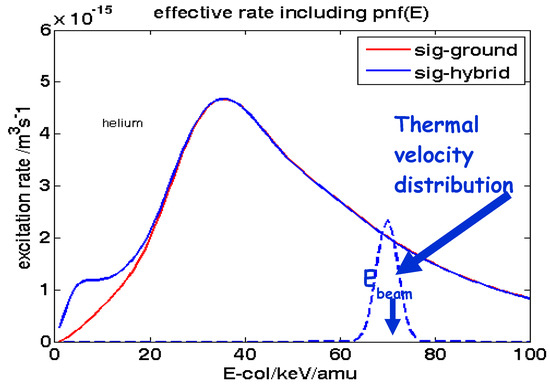 For the case of thermal ions with low ion temperature the relative collisional velocity between the ions and beam atoms is dominated by the beam velocity and hence the change of the effective atomic emission rate is only very small over the Maxwellian distribution. This effect is exemplified in Figure 17.