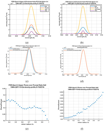 (a) Synthetic Non-Gaussian HeII plume spectrum for ‘worst plume case’ using E-port-Upper with lines of sight almost parallel to magnetic field lines. Halo/prompt 29%, plume/prompt 35%; (b) Synthetic HeII plume spectrum for ‘minimum plume case’ using U-port-3 with lines of sight 60° to magnetic field lines. Halo fraction 23%, plume/prompt 1.9%; (c) Synthetic non-Gaussian HeII plume spectrum and comparison to normalized Gaussian shape of prompt ACX spectrum for ‘worst plume case’ using E-port-Lower with lines of sight almost parallel to magnetic field lines. Plume/prompt 35% at r = 0.4; (d) Synthetic near Gaussian HeII plume spectrum and comparison to normalized Gaussian shape of prompt ACX spectrum for ‘minimum plume case’ using Uport-3 with lines of sight 60° to magnetic field lines. Plume/prompt 2% at r = 0.3; (e) Plume-over-Prompt ratio for ‘worst plume case’ using E-port-Upper with lines of sight almost parallel to magnetic field lines. (f)Plume-over-Prompt ratio for ‘minimum plume case’ using Uport-3 with lines of sight about 60° to magnetic field lines.