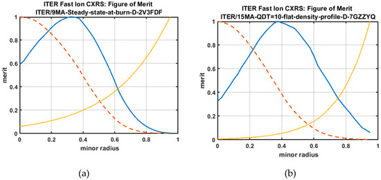 (a) Figure of merit for Fast Ion CXRS on confined alpha particles. Solid line: nfast*nbeam (normalized). Dashed line: nfast (max. 2.8 × 1018 m−3). Dotted line: nbeam (max. 3.0 × 1014 m−3). E-port-3-Upper, DNB 100keV/amu, 36A, 9MA_Steady_state_at_burn_D_2V3FDF; (b) Figure of merit for Fast Ion CXRS on confined alpha particles. Solid line: nfast*nbeam (normalized). Dashed line: nfast (max. 2.2 × 1018 m−3). Dotted line: nbeam (max. 2.8 × 1014 m−3). E-port-3-Upper, DNB 100keV/amu, 36A, 15MA_QDT=10_flat_density_profile_D_7GZZYQ.