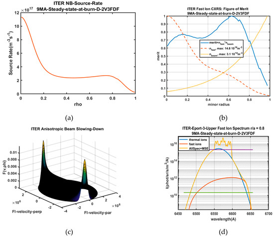 The calculation of the Fast Ion Source Rate is straightforward for the case of fusion alpha particles, since one can assume toroidally symmetric profiles for nd, nt, and Ti, but in the case of neutral beam injection with its strongly anisotropic slowing-down velocity distribution function (cf. [28] and Figure 22c) requires a more refined procedure taking into account the exact injection geometry as well as observation geometry and magnetic field configuration. A crucial modeling input for the Fast Beam Ion CXRS case is also the beam-ion source rate which is defined by: