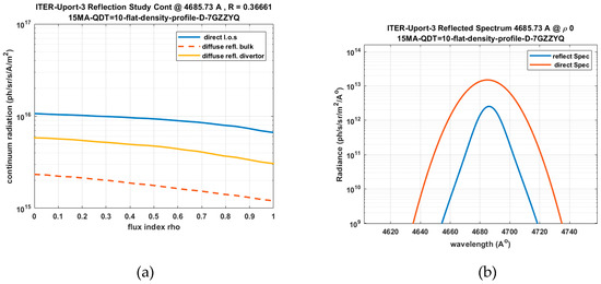 Contamination of optical signals by reflections from the tokamak vessel wall is a matter of great concern [52,53,54,55,56]. For machines like ITER and future reactors, where the vessel wall will be predominantly metallic, this is potentially a risk factor for quantitative optical emission spectroscopy. This is in particular the case when Bremsstrahlung continuum radiation from the bulk plasma is used as a common reference light source used for the cross-calibration of visible spectroscopy. In SOS a model assuming diffuse reflection has been developed for the Bremsstrahlung which is a broad extended source. In contrast, a complete bidirectional reflectance distribution function (BRDF) based model has been developed in order to estimate the reflections from more localized sources like the charge exchange (CX) emissions along the neutral beam path. In contrast to more advanced recent multiple diffuse reflection models, as for example, described in [55,56] SOS uses a rather crude single diffuse reflection model for a preliminary first assessment of the expected fraction of reflected light. The results are in the same order of magnitude, but are based on rather moderate reflection level (40% for a beryllium wall). Two illustrating examples for the high-density ITER scenario (‘worst case’) are shown for the case of diffuse reflection of continuum radiation from bulk plasma and diverter region (Figure 23a), and accumulated reflected ACX spectra emitted along the neutral beam path (Figure 23b). The reflected spectrum is about 11% of the direct ACX spectrum and is characterized by a non-Gaussian shape.