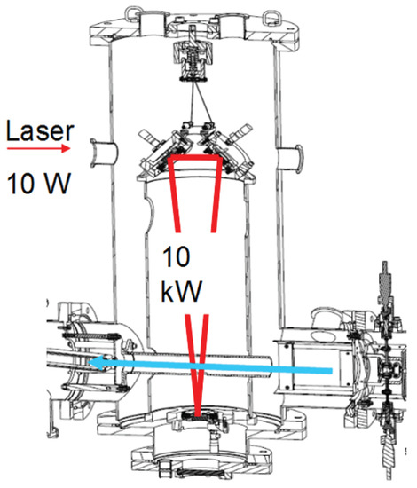 anions are illuminated by the laser beam, inside an intra-vacuum optical cavity (Figure 1), and some of them are photodetached. The photon momentum, about kg m/s at the wavelength nm, is several orders of magnitude smaller than the ion momentum, about kg m/s, which makes the deviation due to photon absorption negligible. The residual ion beam is de-merged from the produced neutral beam by a transverse electric field, a few cm downstream of the interaction region. A Beam Imaging Solutions® BOS-25 “Beam observation system” (Logmont, CO, USA) can be used to bring both the ion and neutral beams to observation. A Faraday cup can also be used to monitor the residual ion current and measure the photodetachment efficiency. The undetached ion beam current was typically .