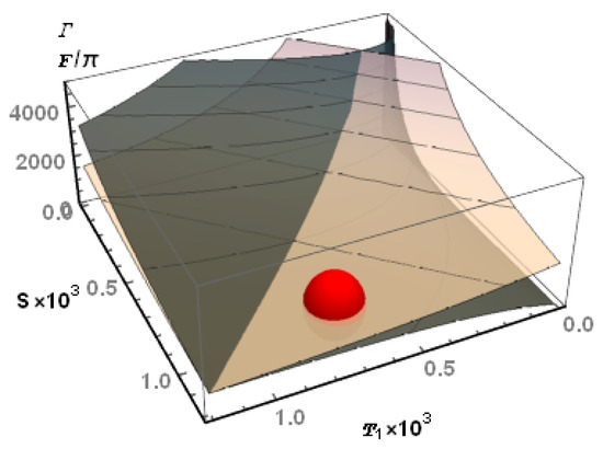 In the well-known case of a symmetrical lossless two-mirror cavity, the amplification factor is just equal to . With three mirrors and, in an even more general case, with losses other than the mirror transmissions (which determine both input and output couplings of the cavity), the ratio can take different values. Optimizing the finesse or the amplification factor are not subject to all identical constraints. Essential differences can be conveniently described by a simultaneous plot of and , as functions of and S, with S the energy fraction lost, for each intracavity round trip, for all other reasons than partial transmission back through the input mirror. The plot is done in Figure 2, assuming that the input mirror is a perfect one, i.e., with a reflection factor . The finesse F, which only depends on the total intracavity losses, then becomes a function of only, which makes the contour lines of constant F parallel straight lines drawn on the developable surface. The and surfaces intersect on the line . Factor can go up to , if S can be made negligible with respect to . In actual situations, however, a constraint is more often that S losses are imposed, and one has to find the best-matching input mirror. The maximum amplification factor, with such a constraint, is met with an input mirror such that , which brings us back to the median line, with a ratio only. As a matter of fact, the working point of the present experiment, shown in Figure 2, even corresponds to a slightly lower ratio, with and .