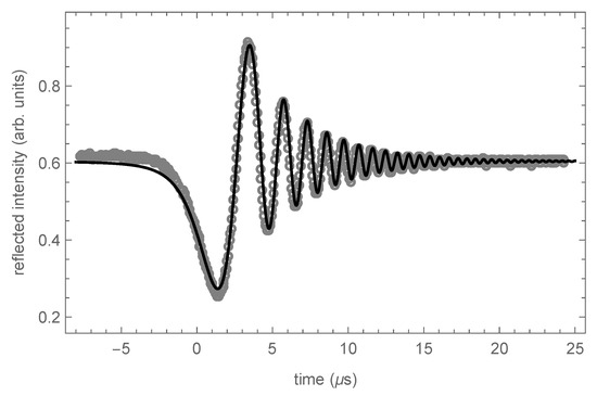 Intensity reflected by the input cavity mirror as a function of time, for a scanning velocity of one of the cavity mirrors . The time derivative of the varying cavity length L can be directly measured by extending the scan to times large enough to make resonances appear in succession, which they do every time L has changed exactly by . The fitting curve here corresponds to a finesse . Dynamic reflection at the input mirror does not only give information about the cavity finesse, but on the transmission coefficient of the input mirror too. The result here is .