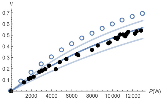 Photodetachment ratio , measured as the attenuation of the negative ion beam when the laser is switched on, as a function of the intracavity power P. The black dots are the experimental points. The continuous lines correspond to what can be predicted by theory, for a cross-section and three different hypotheses for the offset of the two laser beams, the one with respect to the other, in the direction perpendicular to the ion beam: zero, 250 and , from top to bottom, respectively. The open circles ○ show the photodetachment ratios that would be obtained for twice heavier, hence times slower D ions, for the most probable value.