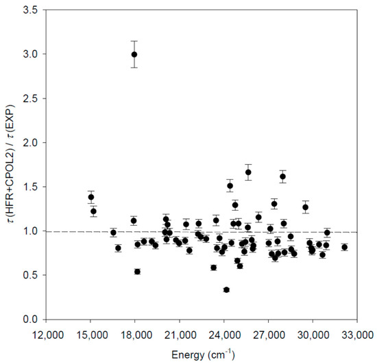 Comparison between the radiative lifetimes (ô) computed in the present work using the HFR+CPOL2 model and the most recent laser-induced fluorescence experimental measurements [22]. The dashed line indicates unity.