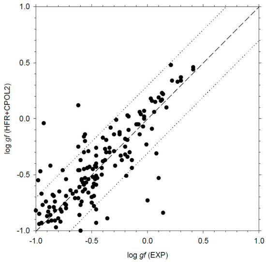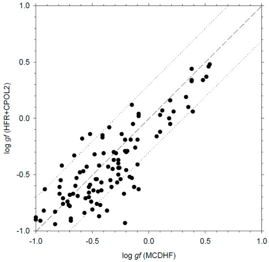 Comparison between the oscillator strengths (log gf) computed in the present work using the HFR+CPOL2 model and the available experimental values [22]. The dashed line corresponds to a perfect agreement while the dotted lines correspond to a discrepancy of a factor of two on the gf-values.