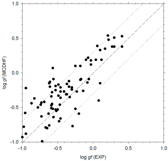 Comparison between the oscillator strengths (log gf) computed in the present work using the MCDHF model and the available experimental values [22]. The dashed line corresponds to a perfect agreement while the dotted lines correspond to a discrepancy of a factor of two on the gf-values.
