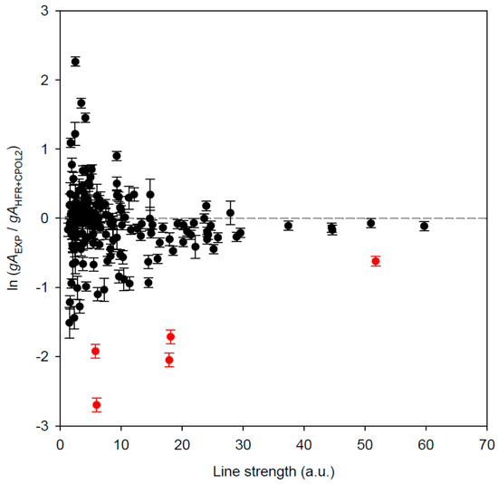 A more robust method of evaluating uncertainties in gf- and gA-values for each calculated transition, as described by Kramida [34], is to plot the differences between theoretical and reference data (i.e., the experimental transition probabilities of Den Hartog et al. [22] in the present work) against the theoretical line strengths (S). Such a plot is given in Figure 6 for the results reported in Table 2. From this figure, one can see that the entire range of calculated S-values can be divided into a few ranges, so that the average discrepancy is nearly constant in each range. Excluding a few outlying points shown in red in Figure 6, the root-mean-square deviations in the quantity ln(gAEXP/gAHFR+CPOL2) are 0.13, 0.28, 0.42, and 0.69 for S > 30 a.u., S = 15–30 a.u., S = 4.3–15 a.u., and S < 4.3 a.u., respectively. This corresponds to average relative deviations of 13%, 32%, 53%, and 98% for gA values. These estimates can be reliably extrapolated to calculated transitions for which there are no experimental data for comparison. Thus, a reliable estimate of uncertainty can be given for each calculated gA value of Table 2, even if there is no experimental data to compare with. From this evaluation, we found that among 227 transitions of Table 2 having no reference data, 8 calculated gA-values have an uncertainty of 13%, 19 have an uncertainty of 32%, 134 have an uncertainty of 53 %, and only 66 are affected by larger uncertainties. This allowed us to give an evaluation of the uncertainty for each computed transition rate reported in Table 2, using the same code letter as the one usually employed in the NIST database [6]. The five abnormally deviating points shown in red in Figure 6 are probably due to insufficient accuracy of the calculated wavefunctions for the levels involved in the corresponding transitions. This was actually highlighted when comparing the calculated and experimental Landé g-factors for each upper odd level of these transitions, i.e., 23,303.26 (J = 7/2), 24,409.68 (J = 7/2), 24,639.26 (J = 3/2), 25,083.36 (J = 7/2), and 28,039.45 (J = 7/2) cm−1, for which our g-values (g = 1.39, 1.34, 0.55, 1.22, and 1.04) showed rather large discrepancies with the experimental ones (g = 1.18, 1.16, 1.78, 1.38, and 1.14).